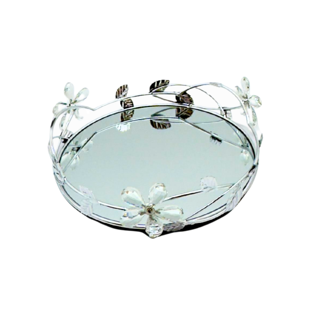 Bandeja con superficie con espejo y marco metálico plateado con detalles florales y apliques tipo cristal. Perfecta para exhibir perfumes, velas o joyería en tocador, baño o mesa auxiliar