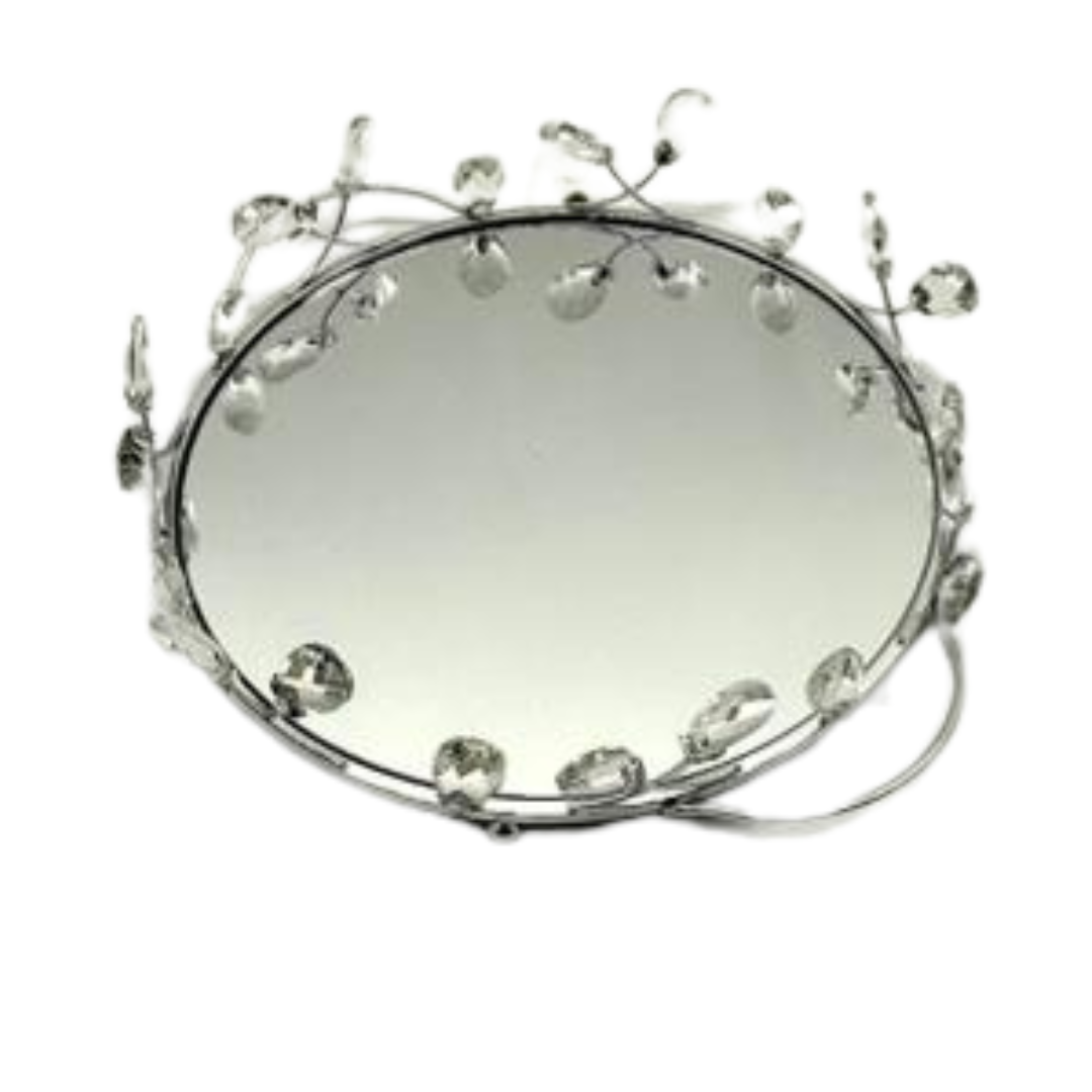 Bandeja con superficie con espejo y marco metálico plateado con detalles florales y apliques tipo cristal. Perfecta para exhibir perfumes, velas o joyería en tocador, baño o mesa auxiliar