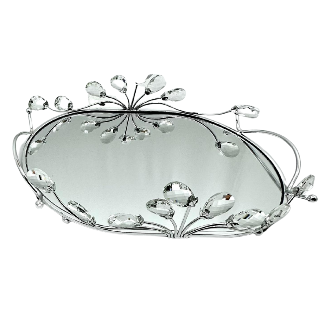 Bandeja con superficie con espejo y marco metálico plateado con detalles y apliques tipo cristal. Perfecta para exhibir perfumes, velas o joyería en tocador, baño o mesa auxiliar