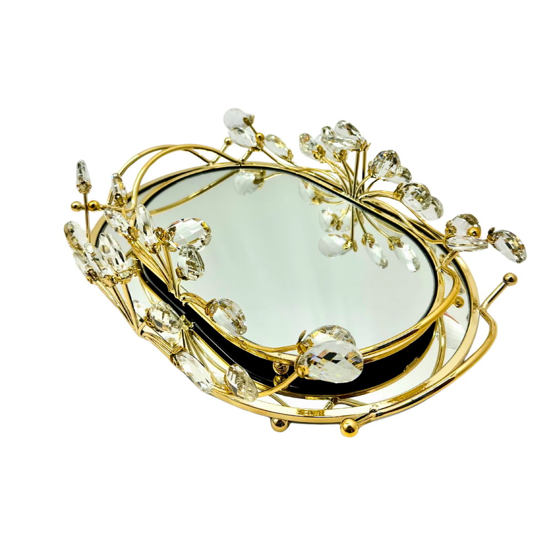 bandeja redondo con superficie con espejo y marco metálico dorado con apliques tipo cristal. Tamaño compacto para lucir y para atención de reuniones sociales