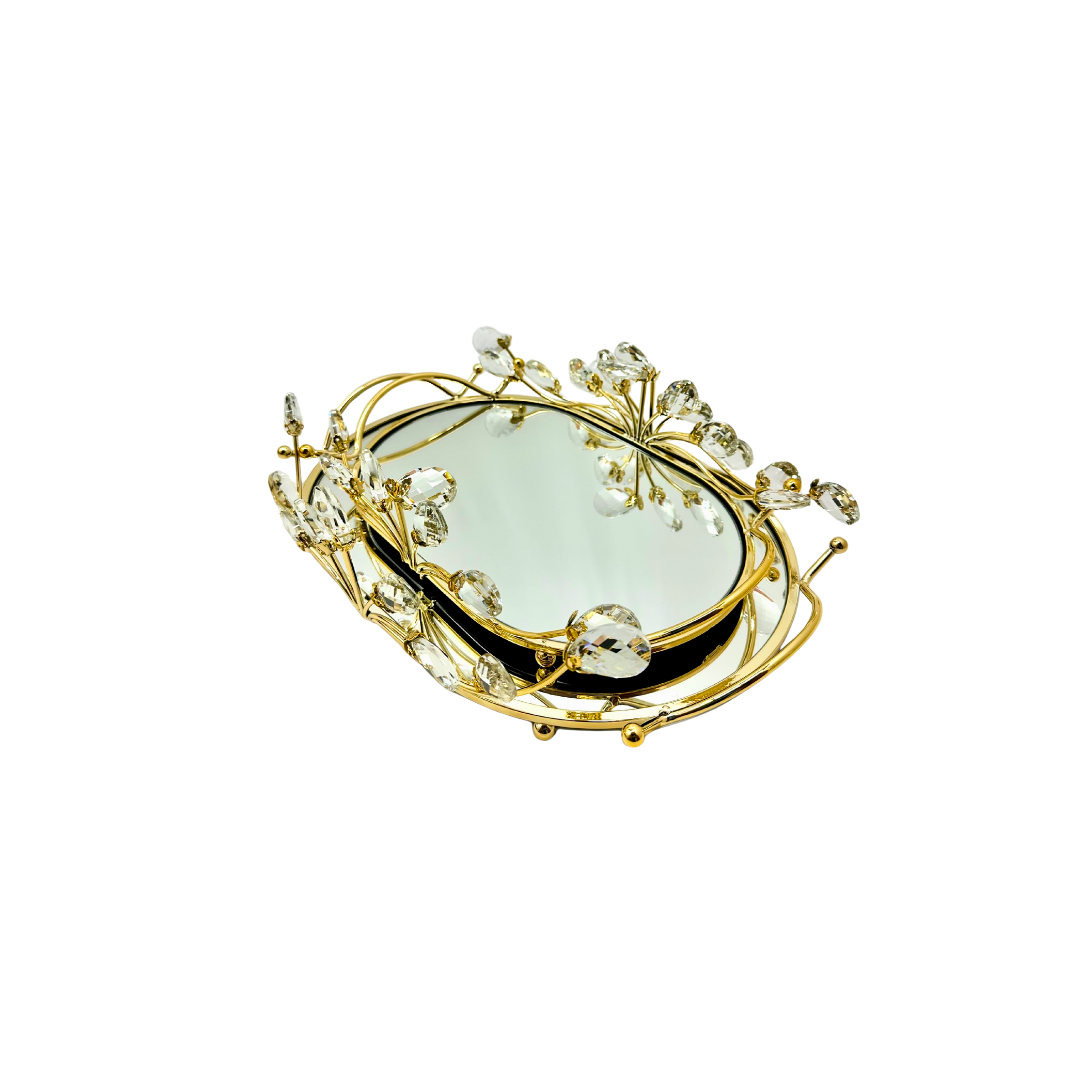bandeja redondo con superficie con espejo y marco metálico dorado con apliques tipo cristal. Tamaño compacto para lucir y para atención de reuniones sociales