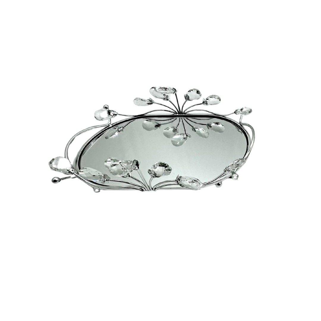 Bandeja con superficie con espejo y marco metálico plateado con detalles y apliques tipo cristal. Perfecta para exhibir perfumes, velas o joyería en tocador, baño o mesa auxiliar
