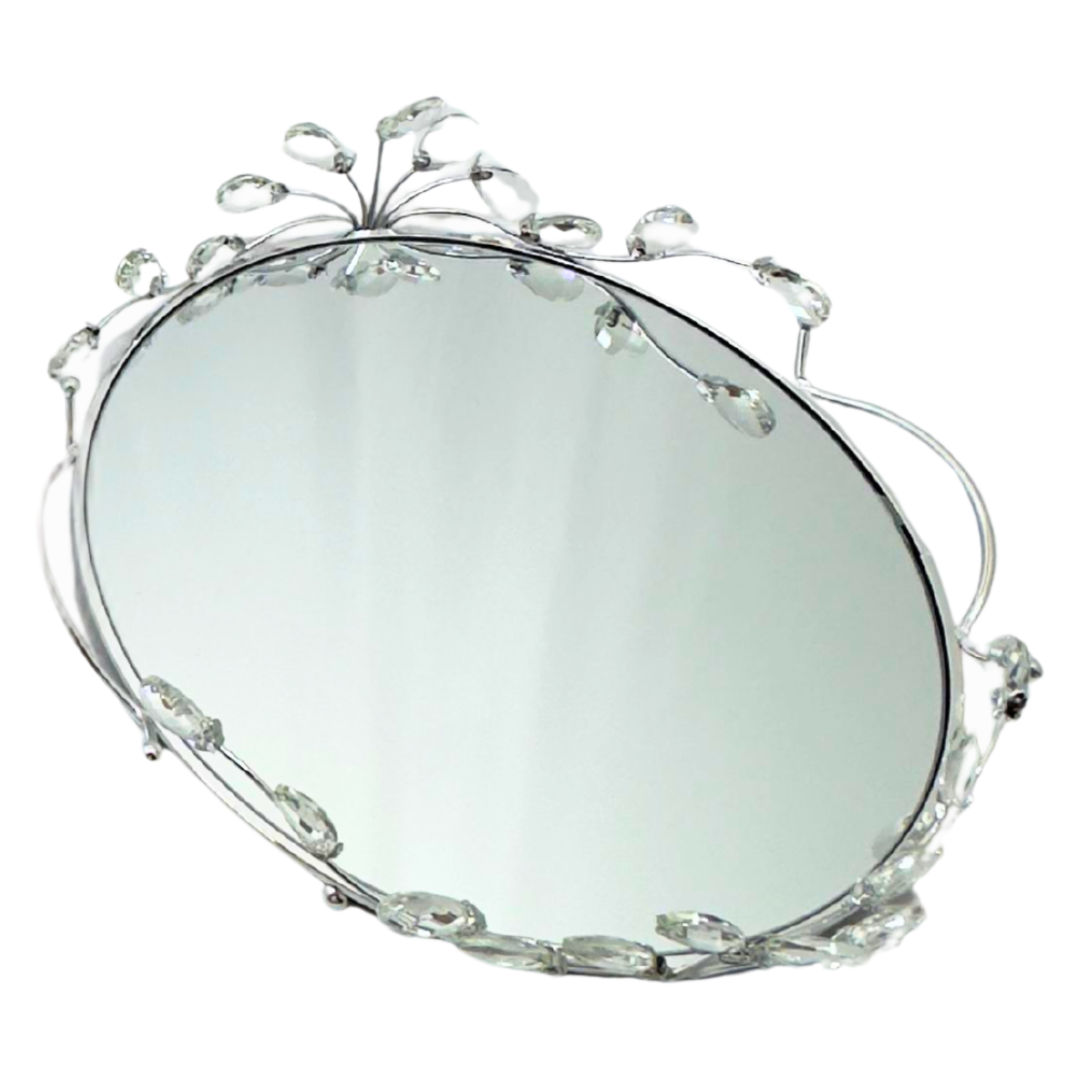 Bandeja con superficie con espejo y marco metálico plateado con detalles y apliques tipo cristal. Perfecta para exhibir perfumes, velas o joyería en tocador, baño o mesa auxiliar