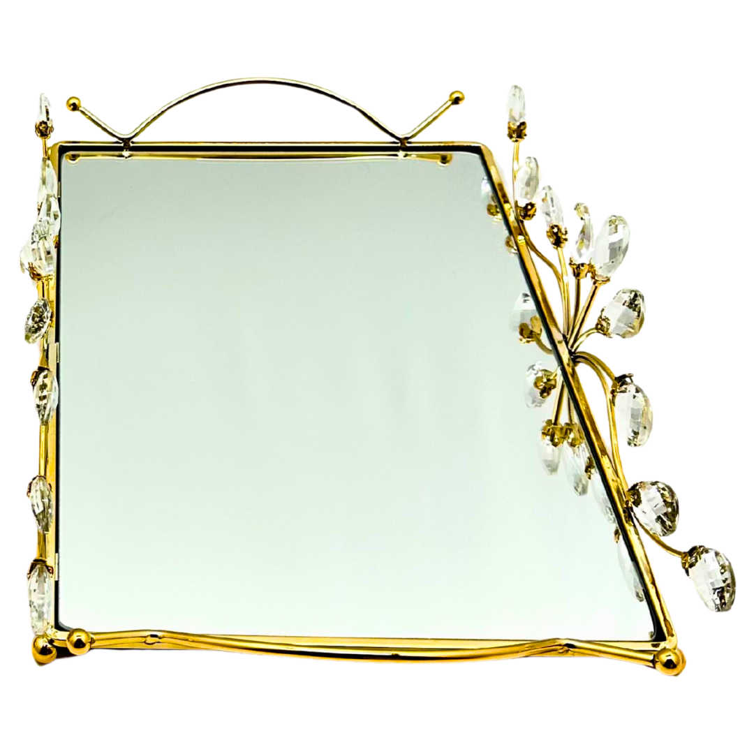 Bandeja rectangular con superficie espejada y marco metálico dorado con apliques tipo cristal. Tamaño compacto para lucir perfumes, velas o joyería en tocador, baño o mesa auxiliar, También para atención de reuniones sociales