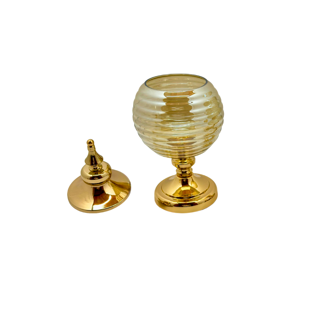 Pieza decorativa de líneas clásicas: copa esférica en vidrio acanalado con base y tapa en metal acabado dorado espejo. Ideal para realzar consolas, comedores y recibidores con un toque elegante