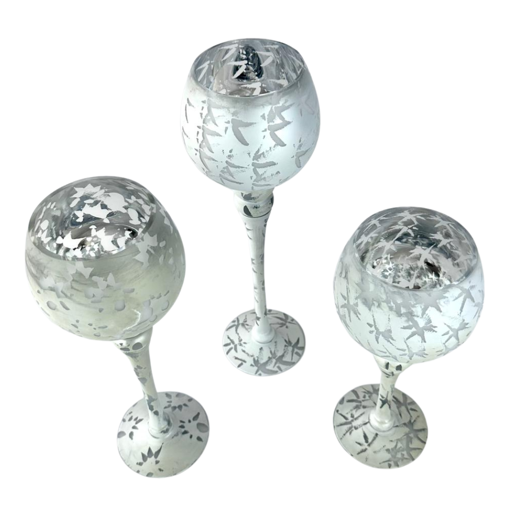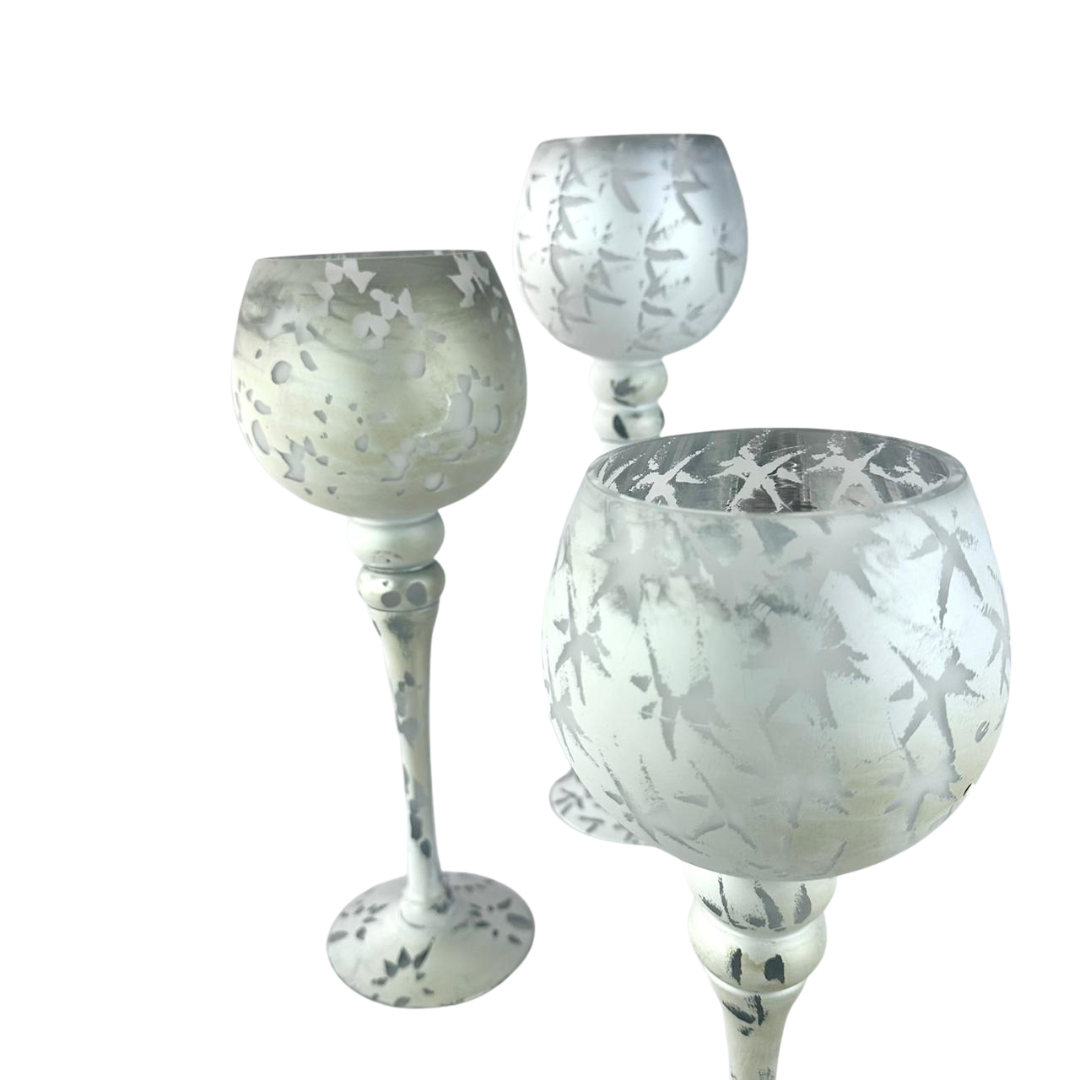 Set de 3 copas con bowl texturizado y tallo transparente. Ideales como centro de mesa, para dar un toque elegante en sala y comedor.