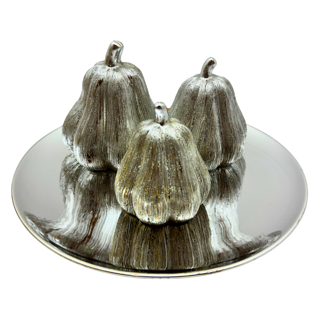 Agrega un toque de elegancia y sofisticación a tu espacio con este exclusivo juego decorativo de frutas plateadas. Compuesto por tres piezas con forma de pera sobre una base circular del mismo tono, este set es perfecto para resaltar cualquier rincón de tu hogar u oficina