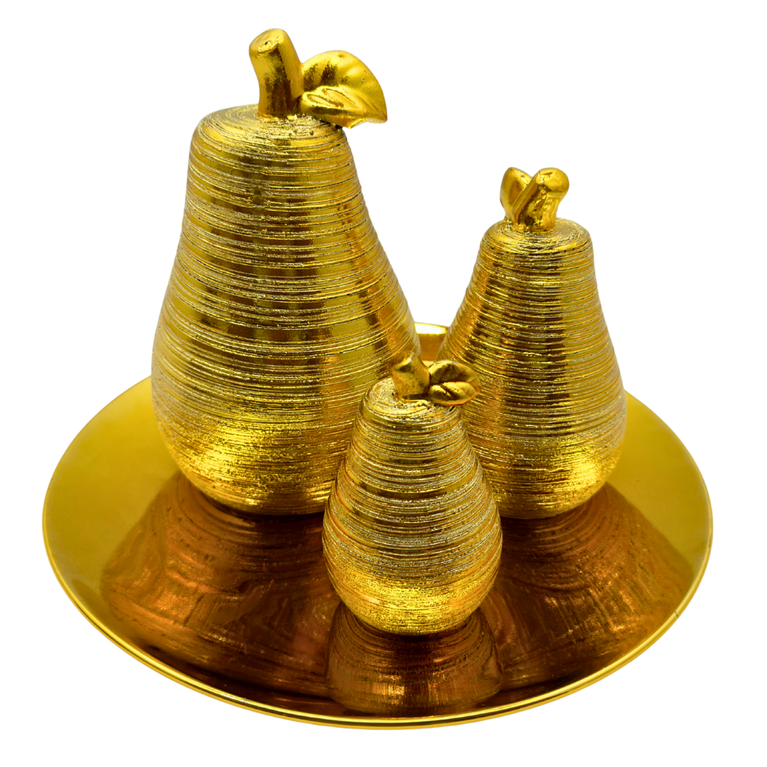 Agrega un toque de elegancia y sofisticación a tu espacio con este exclusivo juego decorativo de peras dorado. Compuesto por tres piezas con forma de pera sobre una base circular del mismo tono, este set es perfecto para resaltar cualquier rincón de tu hogar u oficina