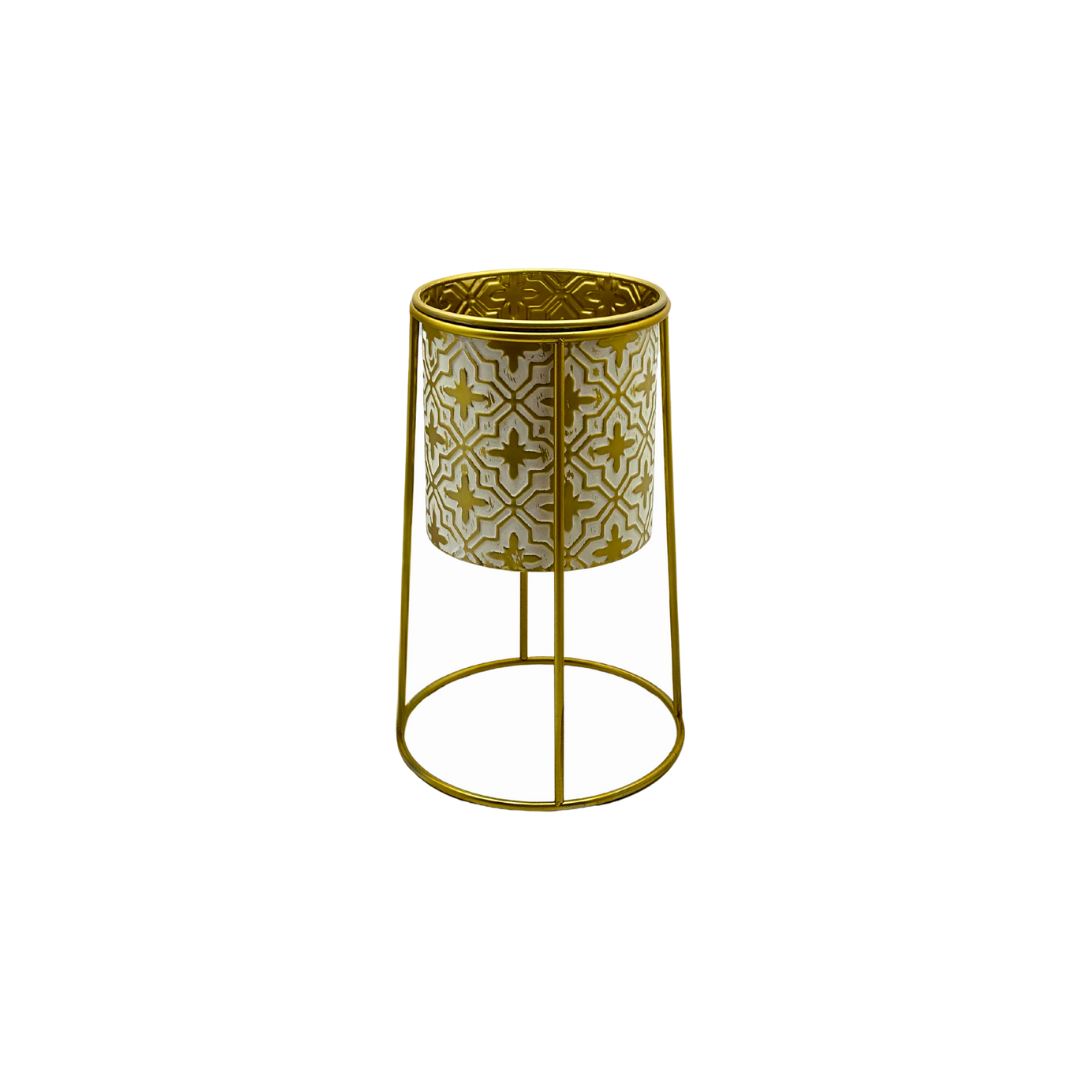 Matera redonda pequeño formato con relieve geométrico y acabado bicolor dorado blanco. Viene sobre estructura de cuatro patas con cruceta para mayor estabilidad. Aporta altura y presencia a plantas pequeñas en sala, estudio o recibidor.