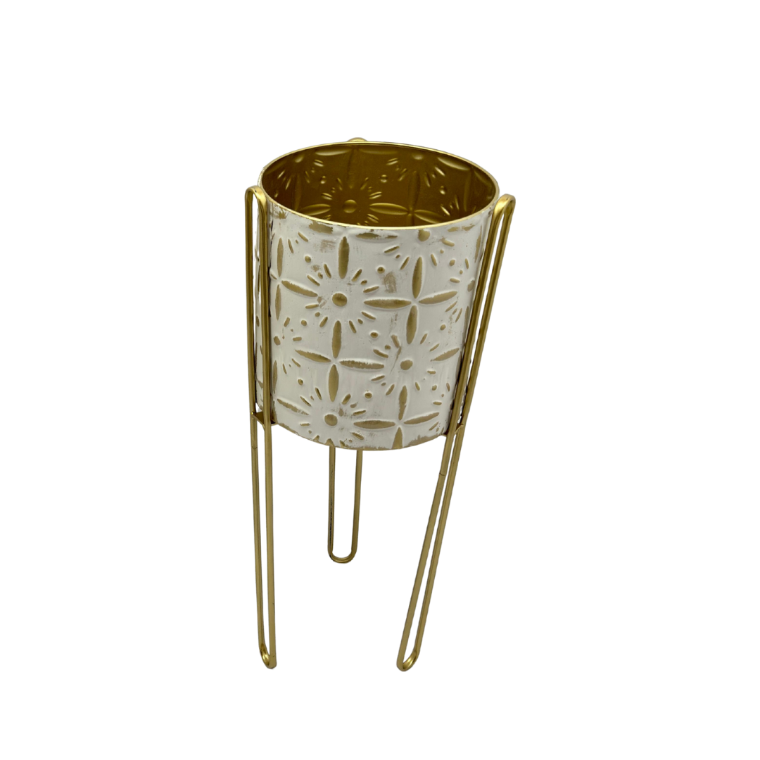 Matera redonda pequeño formato con relieve geométrico y acabado bicolor dorado blanco. Viene sobre estructura de cuatro patas con cruceta para mayor estabilidad. Aporta altura y presencia a plantas pequeñas en sala, estudio o recibidor.
