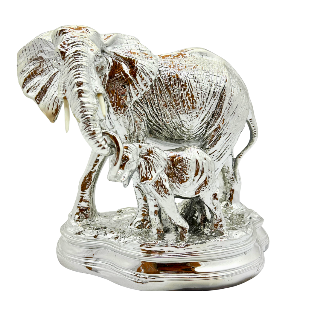 Esta encantadora pareja de elefantes combina elegancia y simbolismo. Con un acabado elegante y detalles en plateado que resaltan su diseño, estas figuras no solo decoran, sino que también representan buena suerte, prosperidad y protección en el hogar