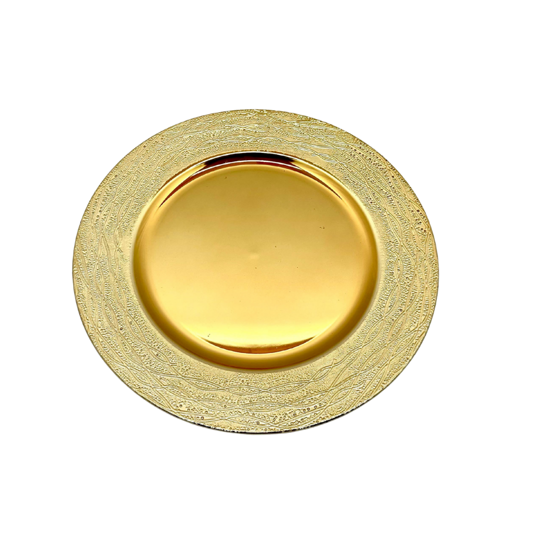 Eleva la presentación de tu mesa con este elegante plato base decorativo, su diseño moderno con textura lo convierte en el complemento perfecto para cenas especiales, celebraciones o simplemente para dar un toque glamuroso a tu decoración diaria.