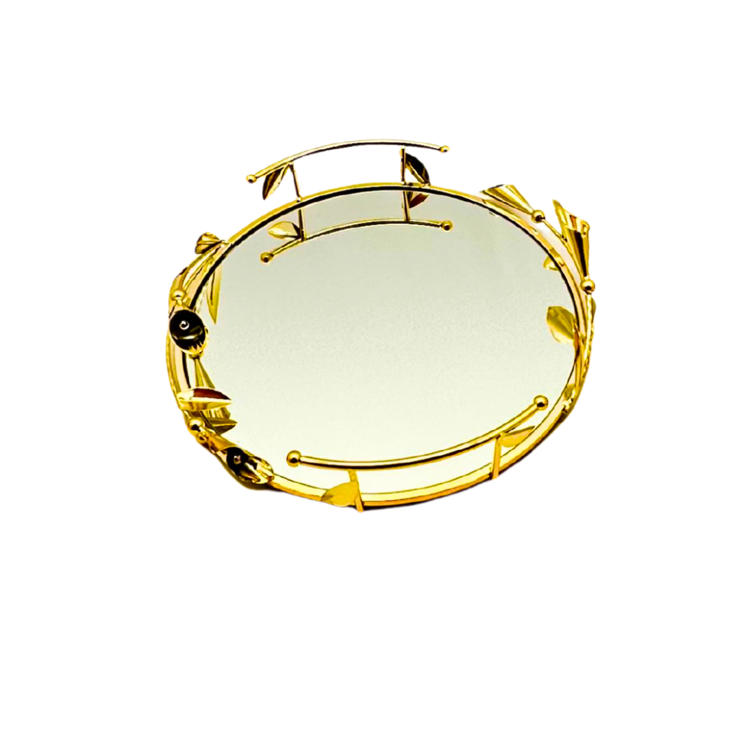 bandeja redondo con superficie espejada y marco metálico dorado con apliques tipo cristal. Tamaño compacto para lucir y para atención de reuniones sociales